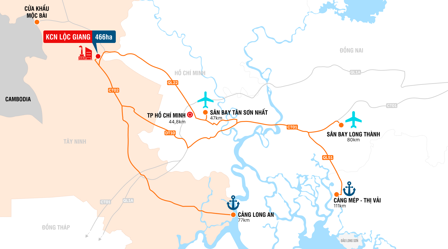 Dự án dễ dàng kết nối với nhiều khu công nghiệp bề thế, TP.HCM, cũng như các tỉnh Tây Ninh, Bình Dương, Tiền Giang,..qua các trục đường liên vùng như DT825, DT822, Tỉnh Lộ 7, Tỉnh Lộ 6,…