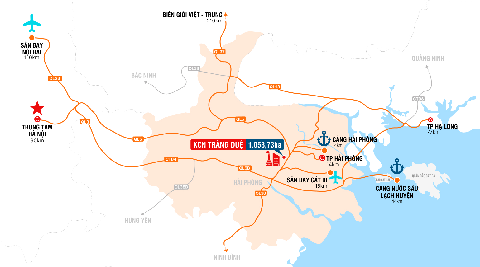 + KCN nằm giữa quốc lộ 5A và cao tốc Hà Nội – Hải Phòng.